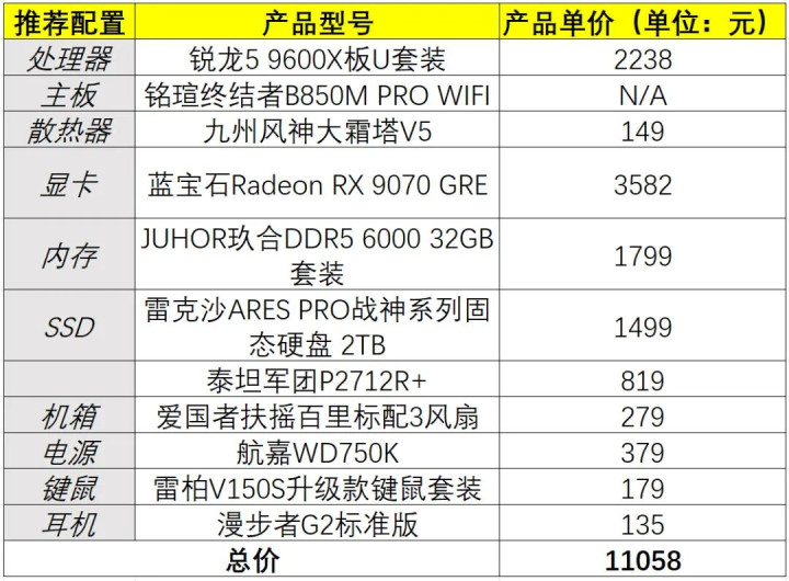 临了咱们也为近期准备组建游戏PC的用户推选一套基于锐龙5 9600X、B850主板、235Hz电竞浮现器与2TB PCIe 5.0固态硬盘的游戏PC配置。值得一提的是,要是用户是拼装全新整机,那么咱们冷落用户取舍系结主板的板U套装。比如咱们在配置中取舍的铭瑄闭幕者B850M PRO WIFI主板,其单独销售的价钱为949元,要是再单独购买锐龙5 9600X,那么主板与经管器将所有花费2420元。而要是咱们取舍系结该主板与锐龙5 9600X的套装,其系结价钱仅需2238元,低廉近200元,清澈更合算。