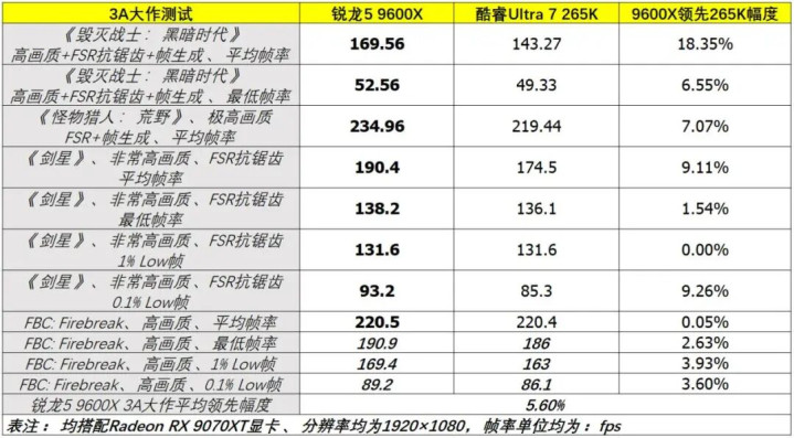在对硬件性能条目更高的3A游戏测试中,咱们搭配定位更高的Radeon RX 9070XT显卡,同期为幸免显卡成为性能瓶颈,将测试分辨率镌汰为1920×1080。测试将主要使用3A游戏的内置基准测试器具,并纪录测试收尾。要是莫得测试器具,则使用第三方计量软件测试在固定清爽下,两款经管器的平均帧率、1% Low帧等数据。起程点在《拔除战士:昏黑时期》中,尽管两款经管器齐使用同样的显卡、画质设定,但它们运行该游戏《算帐》关卡基准测试的帧率却有清澈远隔。其中酷睿Ultra 7 265K的平均帧率为143.27fps,锐龙5 9600X的平均帧率却高达169.56fps,当先多达18.3%。同期在最低帧率方面,锐龙5 9600X也有上风,达到52.56fps,当先酷睿Ultra 7 265K达6.5%,后者还不到50fps。这意味着使用锐龙5 9600X经管器运行《拔除战士:昏黑时期》将愈加流通,不会出现卡顿的满足。