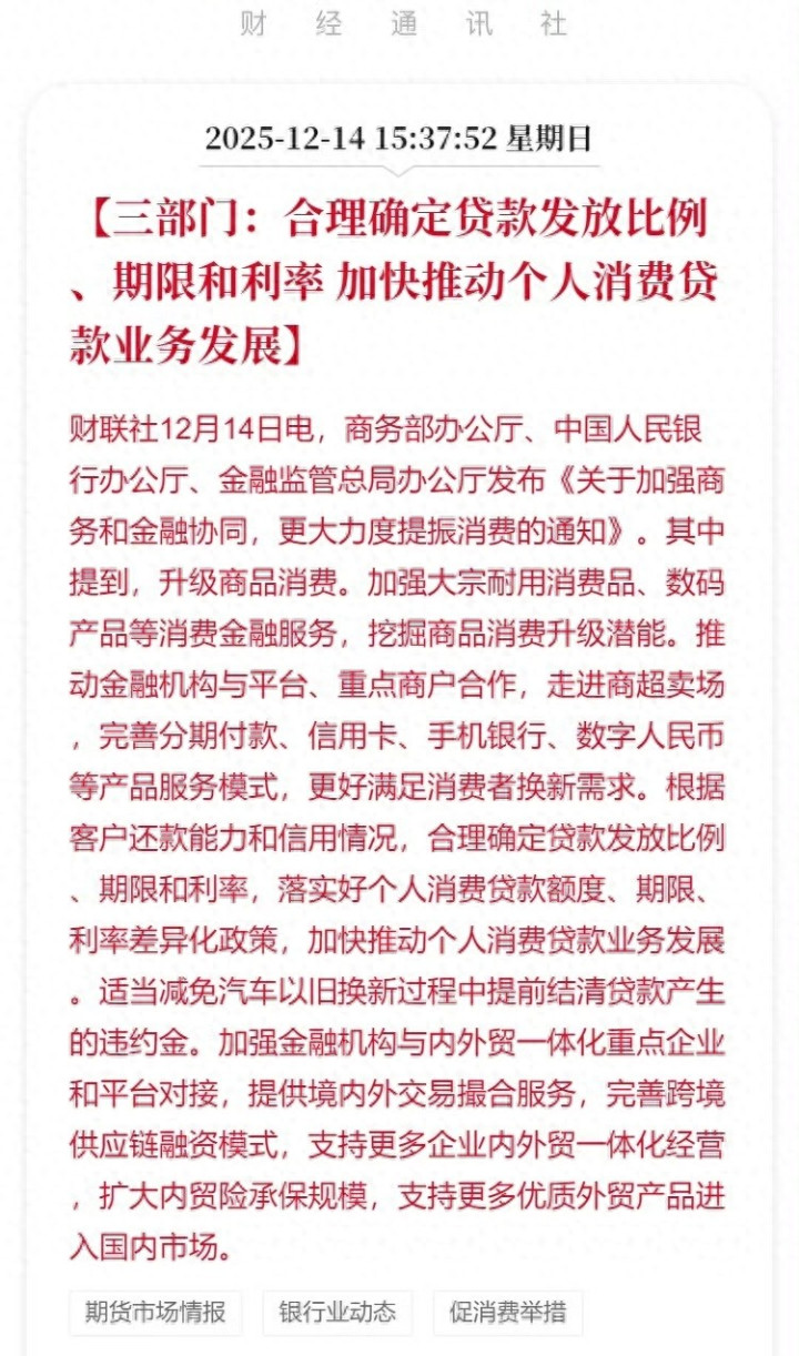 外部环境风浪诡谲,里面转型爬坡过坎。中央经济责任会议把“指导金融机构加力复古扩大内需”写进任务清单,三部门应声而动,从“单兵作战”升级为“协同作战”,从“临时撒券”转向“长效输血”,为“十五五”开局最初埋下一颗忽地“起爆器”。